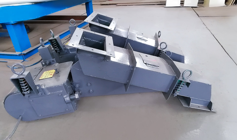 電磁振動(dòng)給料機(jī)結(jié)構(gòu)上主要由料槽、電磁激振器、減振器組成,激振器又由電磁鐵(鐵芯和線圈)、銜鐵和裝在兩者之間的主振彈簧等構(gòu)成,是產(chǎn)生振動(dòng)的激振源,激振器的工作可以通過一定的控制裝置進(jìn)行控制。